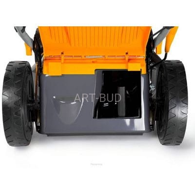 Specjalna konstrukcja kosza na trawę o pojemności 60l ułatwia jego montaż i demontaż. Dla wygody użytkowania, na obudowie umieszczono wskaźnik zapełnienia kosza.