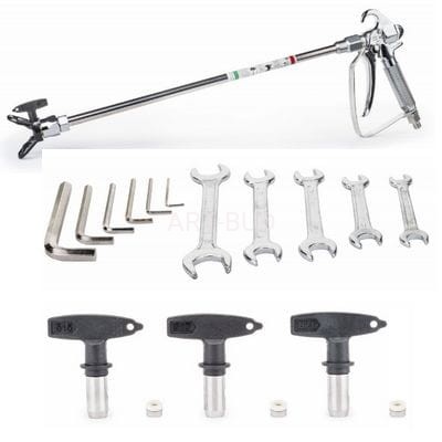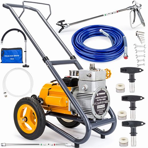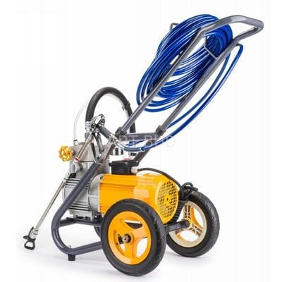 Kompaktowy zestaw malarski z bogatym kompletnym wyposażeniem dodatkowym, hit sprzedaży, niezbędne wyposażenie dla każdej obsługi technicznej eksploatacji budynków, czy małych robót malarskich. Agregaty malarskie hydrodynamiczne służą do malowania praktycznie wszystkich typowych podłoży budowlanych m.in. ścian wewnątrz i na zewnątrz budynków mieszkalnych i przemysłowych. Malowanie hydrodynamiczne polega na sprężeniu farby i natrysku bez użycia powietrza na malowane powierzchnie.