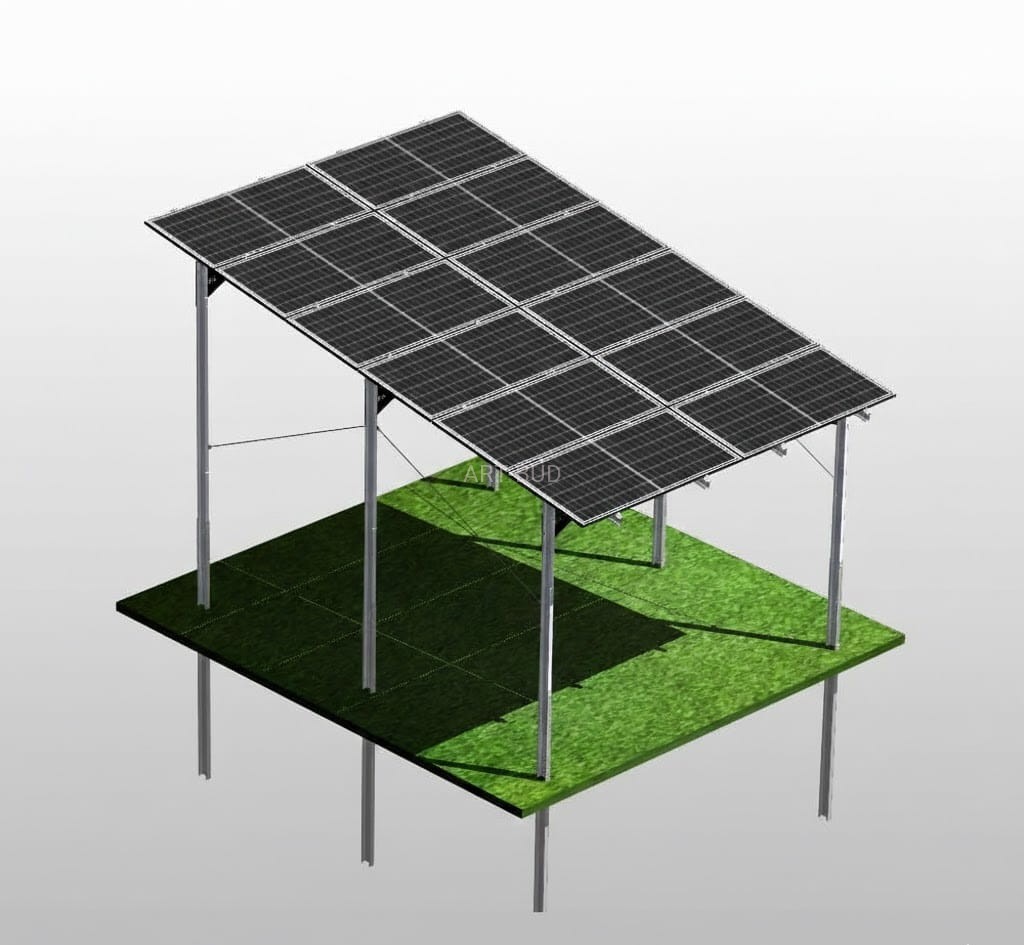 To modułowa stalowa konstrukcja zaprojektowana do montażu paneli fotowoltaicznych o różnej skali od mniejszych instalacji 12-modułowych po większe układy 30-modułowe. Szerokość konstrukcji pozwala na optymalne rozmieszczenie paneli, a stały kąt nachylenia 10° zapewnia maksymalną efektywność produkcji energii słonecznej. Solidna stalowa rama z powłoką antykorozyjną zapewnia trwałość i bezpieczeństwo.
