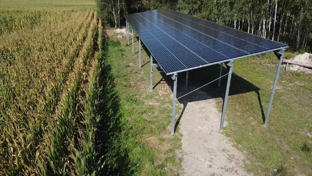 - Montaż wbijany w grunt: konstrukcje są montowane za pomocą słupów wbijanych w grunt na głębokość ok. 2 m.