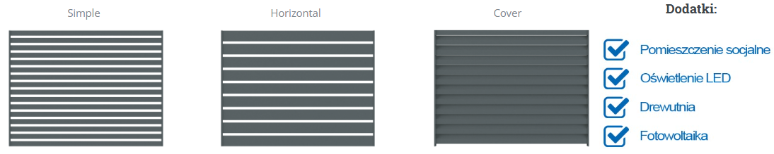 - Możliwość rozbudowy - opcjonalne boczne przysłony i zabudowy poprawiają ochronę i funkcjonalność