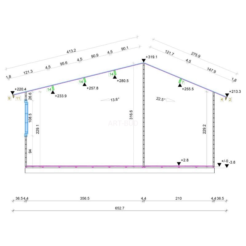 - Dach o zróżnicowanym kącie nachylenia (13,8° / 22,5°) zapewniający sprawne odprowadzanie wody.