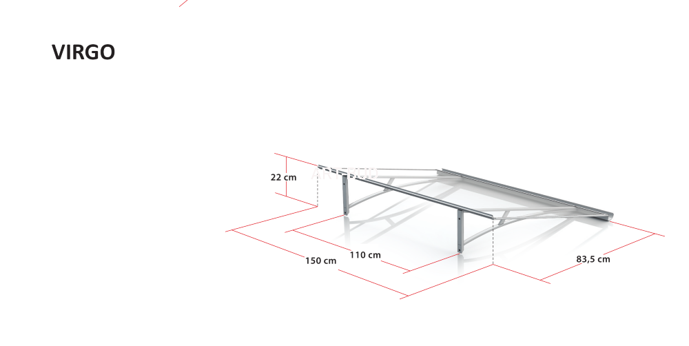 Wymiary daszku Virgo: szerokość: 150 cm, głębokość: 83,5 cm, wysokość: 22 cm, kształt: płaski, sposób montażu: na wspornikach, rodzaj pokrycia: kompozyt.