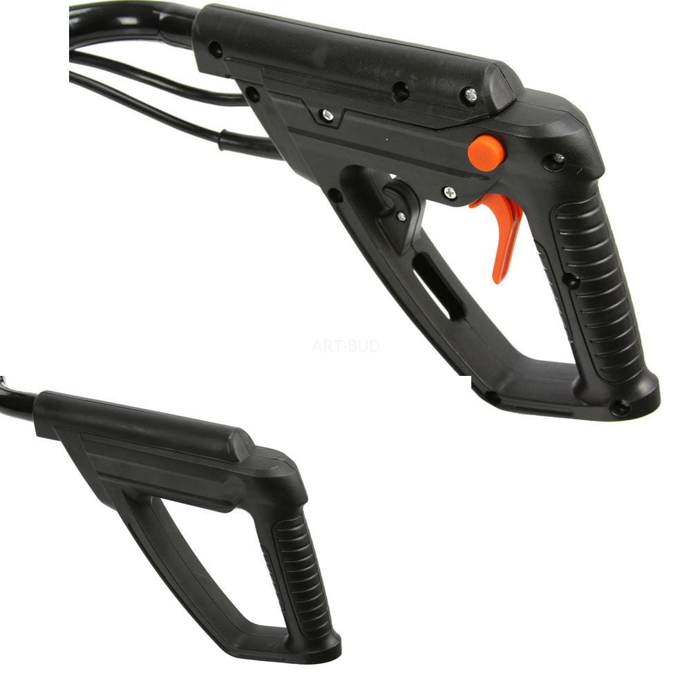 Uchwyty pokryte są antypoślizgową okładziną, która zwiększa pewność chwytu podczas pracy. Na rękojeści głównej zamontowano dźwignię uruchamiająca mechanizm napędowy noży oraz manetkę do regulacji prędkości obrotowej silnika. Dźwignia posiada zabezpieczenie uniemożliwiające przypadkowe uruchomienie przekładni obrotowej.