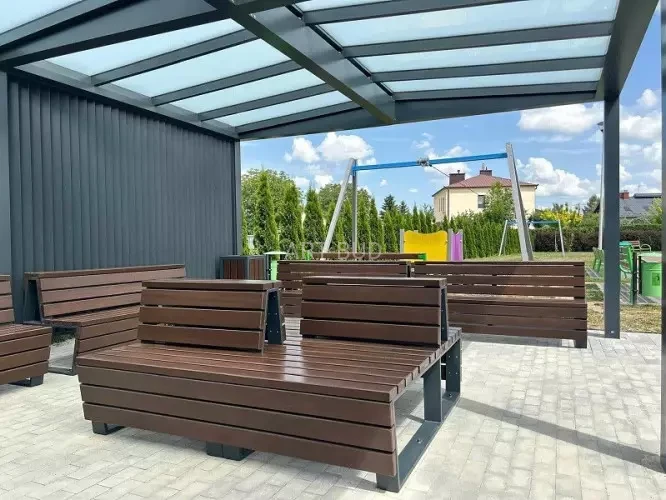 Kolor drewna oraz stali można dobrać według własnych preferencji. Deski siedziska i oparcia wykonane są z drewna iglastego, które przed montażem jest szlifowane i frezowane, a następnie trzykrotnie pokrywane lazurą do drewna metodą natryskową. Dzięki temu drewno zyskuje estetyczny wygląd i skuteczną ochronę przed zmiennymi warunkami atmosferycznymi – to znacznie trwalsze rozwiązanie niż tradycyjny impregnat.