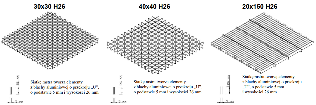 Dostępne również rozmiary oczek w wymiarach: 50 x 50, 60 x 60, 75 x 75, 86 x 86, 100 x 100, 120 x 120, 200 x 200 mm - Wysokość profilu: 26 mm