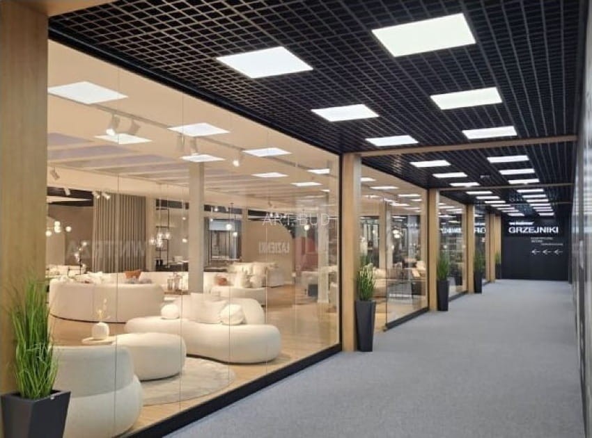 - Otwarta struktura rastra – zapewnia dostęp do instalacji i wentylację pomieszczeń.
