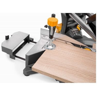 Regulowany pionowy zacisk pozwala na zamocowanie materiału w taki sposób aby nie przesuwał się podczas ciecia z posuwem. Piła ukosowa do drewna posiada dwa miejsca montażowe, dzięki czemu można montować zacisk z lewej lub prawej strony urządzenia.