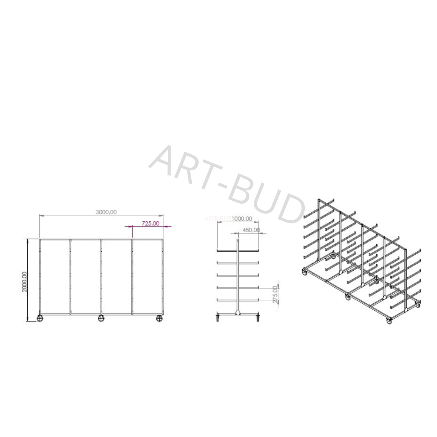 Wózek regałowy, Mobilny regał wspornikowy 3000x1000 podwójny