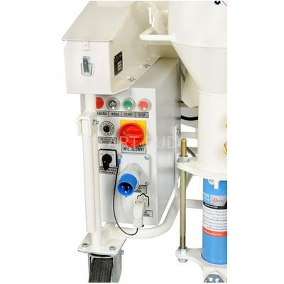 | DANE TECHNICZNE: Wydajność : płynnie regulowana od 8 do 40 l / min Odległość podawania : do 30 m Zasilanie prądem: 230 Volt Napęd : 2 trójfazowe silniki 400V/ 50 Hz Motoreduktor 5,5 kW 236 obr./min sterowany falownikiem, obroty regulowane po przez falownik Motoreduktor 0,55 kW 22 obr./min Kompresora: 1040W wydajny 250 l/min Pompa wody : 0,37kW max.15 l/min Wymiary D/S/W: 1250/720/1530 mm Wysokość zasypu : 90cm |