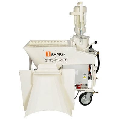 BAPRO one STRONG MAX to flagowy produkt BAPRO, prawdziwie innowacyjny, posiadający opatentowane i zastrzeżone rozwiązanie techniczne polegające na zmiennym systemie pracy pomiędzy mieszarko-pompą a pompą. Szereg prac budowlanych dotychczas było i jest wykonywane w sposób ręczny bądź przy użyciu kilku maszyn. Z myślą o minimalizacji kosztów i wzroście wydajności pracy opracowana została maszyna BAPRO one STRONG MAX, wyznaczająca nowe standardy dla maszyn tynkarskich. Maszyna w odróżnieniu od typowego agregatu tynkarskiego pozwala poszerzyć zakresu usług nie koncentrując się tylko i wyłącznie na fabrycznie suchych mieszankach typu tynki gipsowe czy cementowo-wapienne ale również dodatkowo tych płynnych np. (tynk elewacyjny, płynne jastrychy, gładzie szpachlowe czy kleje). Dodatkowo maszynę możemy wykorzystać do natryskiwania tradycyjnej zaprawy cementowo - wapiennej wymieszanej najpierw w betoniarce. Agregat wyróżnia się też jakością zastosowanych podzespołów. Nasz agregat tynkarski zawiera specjalnie skonstruowane wzmocnione motoreduktory zapewniając ciągłość mieszania, wysokowydajny bezobsługowy (bezolejowy) kompresor dostarczający odpowiednią ilość powietrza do natrysku zapraw, armaturę wodno - powietrzną opartą na module ze stali nierdzewnej by wykluczyć korozję, a najlepsza automatyka przemysłowa jest gwarancją bezawaryjnego sterowania maszyną. Bezpieczne a zarazem poręczne oprzyrządowanie zadba o wygodę prowadzenia pracy. Obsługa maszyny jest bardzo prosta! Szybko następuje proces automatycznego mieszania a następnie natryskiwania. Opracowana konstrukcja wieloelementowa maszyny pozwala sprawnie ją przemieszczać pion - poziom a łatwość manewrowania zapewnia system czterech kół jezdnych obracalnych wokół osi.
