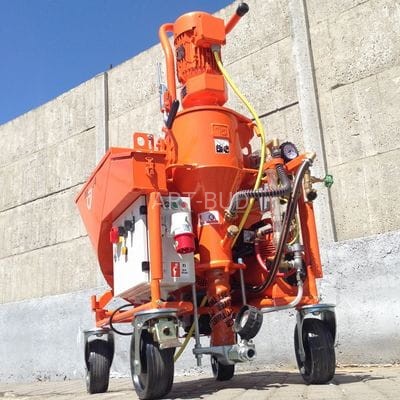| PARAMETRY TECHNICZNE: Wydajność: ok.6-35 L/min. Ciśnienie: max.30 bar. Odległość podawania: ok.50 m Napęd: silnik pompy- SK 25 5,5 kW, ok.385 obr./min Silnik dozownika: 0,75 kW, ok.28 obr./min Moc sprężarki: 0,9 kW, Ciśnienie zasilania wody:2,5 bar przy uruchomionym urządzeniu Wysokość zasypowa: 910 mm Długość całkowita : 1,200 mm Szerokość: 720 mm Wysokość: 1,530 mm Sprężarka: 24 kg Ciężar całkowity: 271 kg |