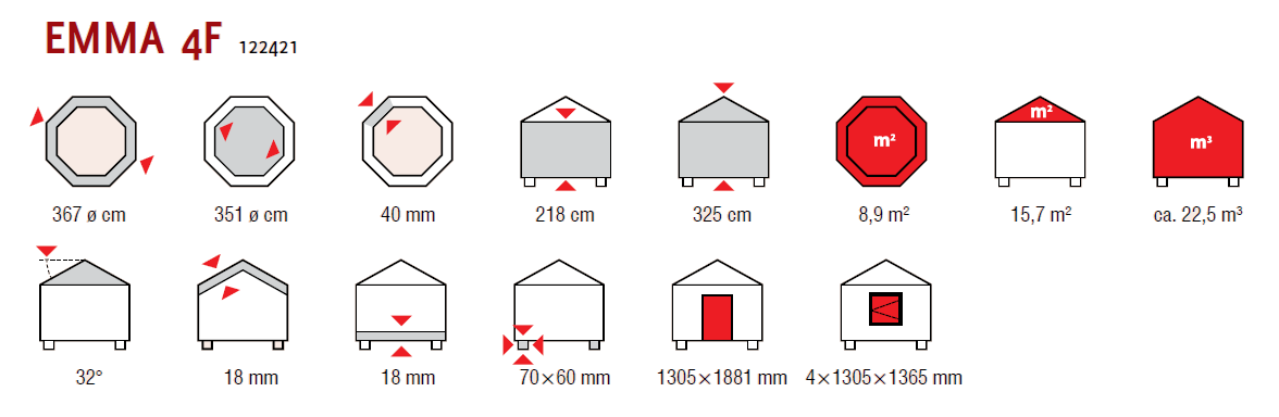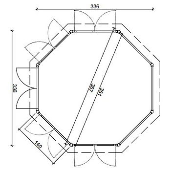 Zewnętrzna średnica altany z zadaszeniem to 367 cm, wewnętrzna 351 cm , przy powierzchni użytkowej 8,9 m2 . Altana została wykonana z 40 mm litego bala świerkowego, co gwarantuje wytrzymałość i stabilność konstrukcji. Impregnowane ciśnieniowo belki podwalinowe dobrze izolują altanę od podłoża. Altana posiada ośmiokątny dach o nachyleniu 32o.