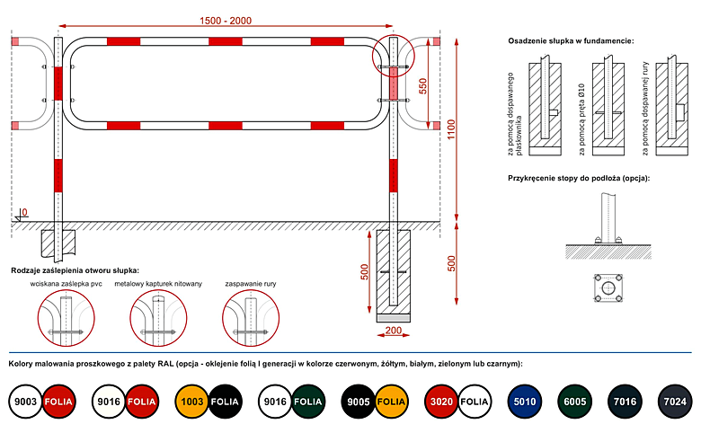 | 2- ocynkowanie + malowanie proszkowe RAL, nakrętek, podkładek, wersja do wbetonowania |