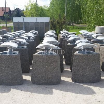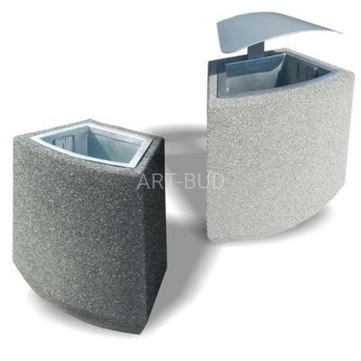 Kosze doskonale sprawdzają się w przestrzeni gminnej lub miejskiej. Są ważnym uzupełnieniem małej architektury na skwerach, rynkach, parkingach i ulicach. Kosz wykonany w technologii betonu płukanego z fakturą zewnętrzna granitu.