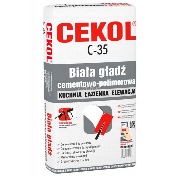 CEKOL C-35 20 kg jest wysokiej jakości materiałem przeznaczonym do wygładzania, wyrównywania i uszlachetniania zewnętrznych ścian budynków (elewacji). Może być również stosowany wewnątrz pomieszczeń, a szczególnie w pomieszczeniach o dużej wilgotności (np. łazienki, sauny, chłodnie). CEKOL C-35 umożliwia wykonanie gładkich powierzchni. Nadaje się do nakładania ręcznego i mechanicznego. CEKOL C-35 jest zaprawą wodoodporną i mrozoodporną. Jest suchą mieszanką wysokiej jakości białego cementu, białych wypełniaczy mineralnych i środków modyfikujących, zapewniających doskonałą urabialność i przyczepność do podłoży mineralnych (np. beton, cegła, gazobeton itp.). CEKOL C-35 nie zawiera składników toksycznych, ani podatnych na żółknięcie pod wpływem światła i warunków atmosferycznych. Jest doskonałym podkładem pod farby emulsyjne, akrylowe, silikatowe, silikonowe i mineralne. Biała barwa pozwala na ograniczenie ilości malowań dla uzyskania pełnego efektu barwnego. CEKOL C-35 polecany jest, jako warstwa zewnętrzna w systemach ociepleń ETICS.