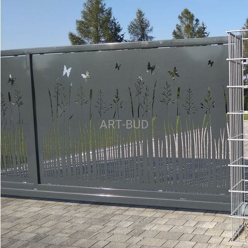 Jest to brama dwuskrzydłowa ogrodzeniowa na stalowej ocynkowanej ramie z wypełnieniem z aluminiowej blachy 2 mm z wzorem wycinanym plazmą CNC. Rama stalowa 40x40mm zawiasami regulowanymi mocowana na słupach stalowych 80x80 mm.Stal ocynkowana i całośc pomalowana na dowolny kolor z palety RAL.