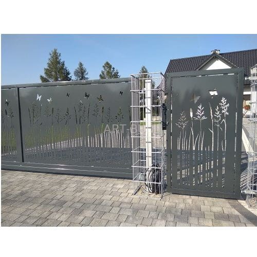 Jest to brama ogrodzeniowa przesuwna na stalowej ocynkowanej ramie z wypełnieniem z aluminiowej blachy 2 mm z wzorem wycinanym plazmą CNC. Rama stalowa 40x60mm zawiasami regulowanymi mocowana na słupach stalowych 80x80 mm.Stal ocynkowana i całość pomalowana na dowolny kolor z palety RAL.