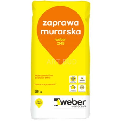 Do 3,0 - 3,5 l czystej, chłodnej wody wsypać 25 kg (worek) suchej mieszanki weber ZM5 i mieszać przez 3 - 4 min. wolnoobrotowym mieszadłem elektrycznym do uzyskania jednorodnej masy. W przypadku stosowania betoniarek, zaprawę mieszać przez 6 - 8 min. Przygotowywać porcje, które zostaną zużyte w ciągu 2 h. Nie dodawać więcej wody niż zalecana ilość, ponieważ obniży to wytrzymałość oraz zwiększy skurcz zaprawy. Niedopuszczalne jest „ulepszanie” wyrobu przez dodawanie piasku, cementu itp. Zaprawę bezpośrednio po wymieszaniu, nanosić kielnią i lekko dociskać murowane elementy. Przestrzegać tradycyjnych zasad technologii murowania. Murować na pełne spoiny 10 - 15 mm.