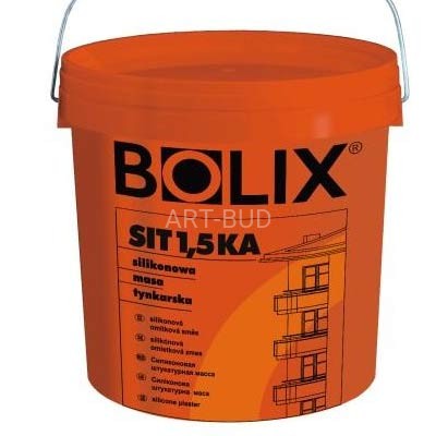 BOLIX SIT 1,5 KA silikonowa masa tynkarska o granulacji ok. 1,5 mm faktura kasza do ręcznego wykonywania ochronnych i dekoracyjnych, cienkowarstwowych wypraw tynkarskich na zewnętrznych ścianach budynków istniejących i nowo wznoszonych oraz wewnątrz pomieszczeń.