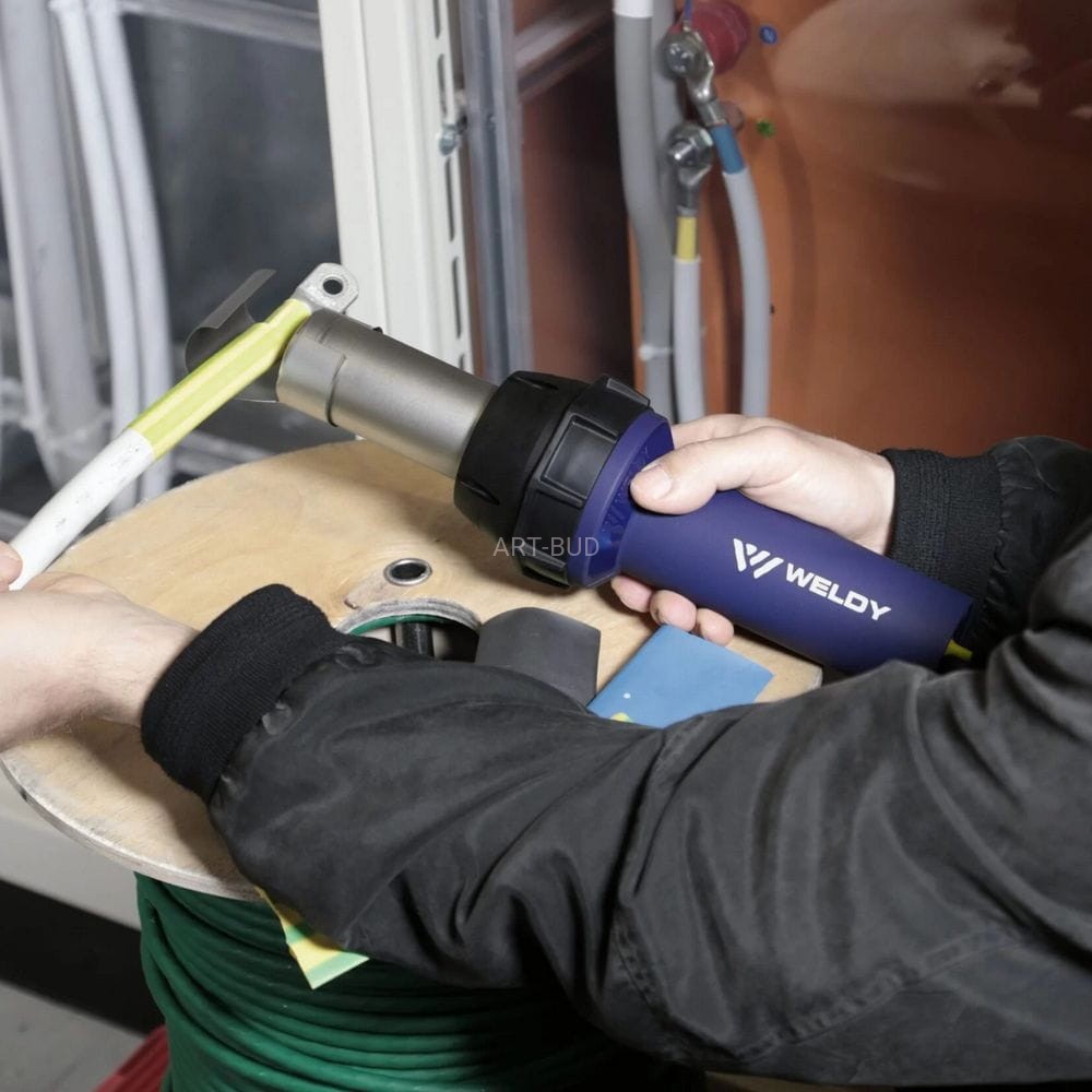 Weldy Energy HT 3400 posiada wbudowany potencjometr do sterowania temperaturą w zakresie 40 – 650°C. Standardowa średnica rury wylotowej 50,5 mm umożliwia zastosowanie dyszy dowolnego producenta jak Leister, Forsthoff, Herz, lansite czy też Steinel.