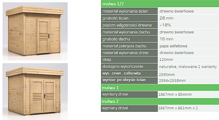 Przedstawiona cena dotyczy domku Malwa w wersji natur, drzwi pojedyncze bez podłogi
