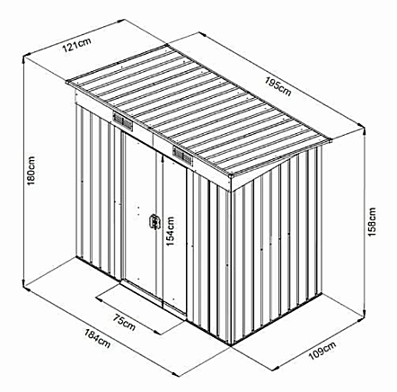 Klasyczny domek ogrodowy z trwałej profilowej blachy powlekanej, stosowany przede wszystkim do przechowywania narzędzi ogrodniczych czy innych materiałów związanych z ogrodem. Kratki wentylacyjne zapewniają wentylację, i zapobiegają gromadzeniu się wilgoci. O 20% grubszy materiał niż o konkurencji co zapewnia wysoką trwałość i odporność. rozmiar podstawy - 119x194x185,5 cm, rozmiar z uwzględnieniem dachu - 131x202,5x185,5 cm, grubość płyty - 0,3 mm, grubość ramy - 0,6 mm, wysokość drzwi - 154 cm.