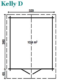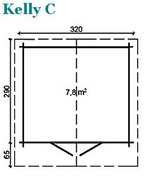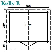 Wymiar całkowity z zewnątrz domku wynosi 320x250 cm, bez wystających elementów 300x230 cm. Dwuspadowy dach o powierzchni ok. 11,35 m2 i grubości 18 mm ma 65 cm wypust z przodu budynku. Ściany domku Kelly B mają grubość 28 mm, natomiast podłoga jest gruba na 18 mm. Domek jest ustawiany na impregnowanych ciśnieniowo podwalinach o profilu 45x70 mm.