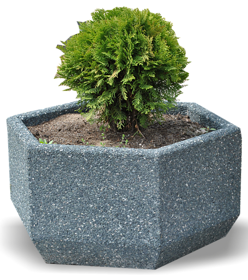 Donica betonowa sześciokątna nr kat 134 Donica wykonana w technologi betonu płukanego z fakturą zewnętrzną grysu amfibolit. Donice betonowe to niezwykle popularny, klasyczny już element miejskiej architektury. Są niezwykle trwałe i odporne na warunki atmosferyczne i uszkodzenia mechaniczne, a dzieki dużej masie, stabilne i bezpieczne dla otoczenia. Duża pojemność, pozwala na zapewnienie roślinom korzystnych warunków glebowych, dzieki czemu rośliny ozdobne w warunkach dobrego oświetlenia i nawodnienia, prezentują sie wyjątkowo korzystnie i efektownie. Produkowane kwietniki i donice betonowe są estetyczne, funkcjonalne, a co najważniejsze trwałe i odporne na wandalizm. Jest to wynikiem zachowania reżimu technologicznego oraz zastosowania odpowiednich