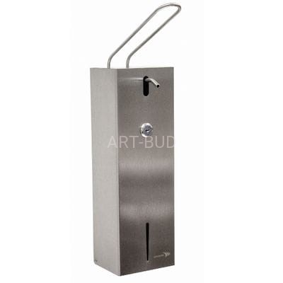Dozownik mydła lub płynu do dezynfekcji w obudowie ze stali nierdzewnej, łokciowy. Wykończenie powierzchni matowe. Materiał z którego został wykonany dozownik, gwarantuje długotrwałe zabezpieczenie powłoki przed korozją. Konstrukcja dozownika jest wandaloodporna zamykana na kluczyk a krawędzie zaokrąglone. Uzupełnianie mydła następuje z opakowania zbiorczego po otwarciu obudowy. Nie wymaga drogich wkładów na mydło. Zbiornik na mydło ma pojemność 1 L.