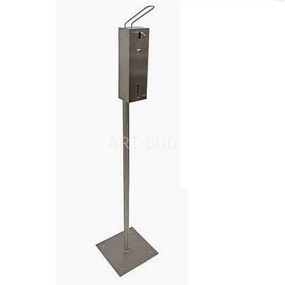 Stojak na dozownik do dezynfekcji wykonany ze stali nierdzewnej AISI 304. Podstawa uniwersalna do zamontowania podajnika na płyn dezynfekujący. Dół podstawy posiada otwory montażowe.