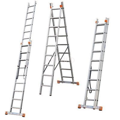 Aluminiowe, dwuczęściowe drabiny ze szczeblami z trzema praktycznymi funkcjami: jako drabiny przystawne, rozsuwane i drabiny wolnostojące.