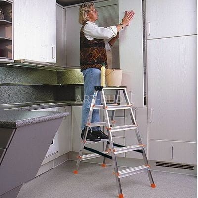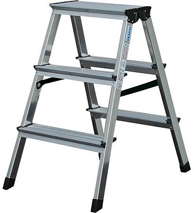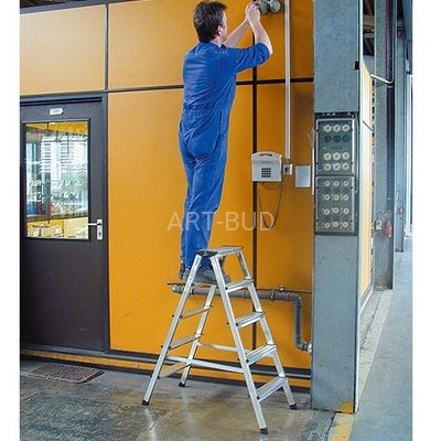 Dwustronna drabina aluminiowa z szerokimi stopniami, oferowana w sześciu wariantach wysokości, nawet do 3,3 m wysokości roboczej. Wygodna, poręczna, niezwykle stabilna i funkcjonalna.