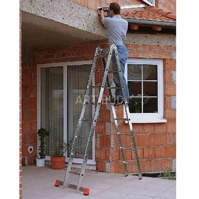 Drabina aluminiowa dwuczęściowa, przegubowa ze szczeblami, z możliwością stosowania jej jako drabiny wolnostojącej lub przystawnej.