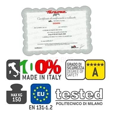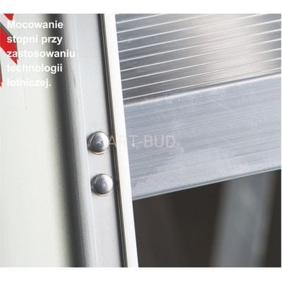 Ponadprzeciętną trwałość schodów zapewnia podłużnica ze specjalnego profilu Dla większej stabilności połączenie między stopniami a podłużnicą zrealizowano za pomocą nitowania w technologii lotniczej. Nośność do 150 kg.