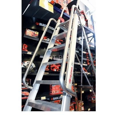 Lekkie składane schody drabinowe z serii DOMUS do zastosowania w przemyśle. Wchodzenie jest wygodne dzięki głębokimi 13 cm stopniom. Posiada platformę roboczą 27x27 cm oraz możliwości składania po pracy. Stopnie i podest z blachy ryflowanej oraz zastosowany pałąk zwiększa bezpieczeństwo użytkownika. Można dokupić poręcze BR LADY.