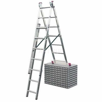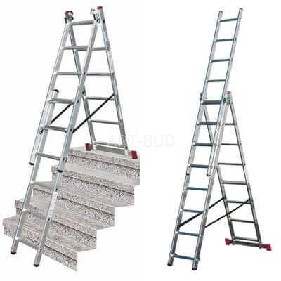 Aluminiowe, trzyczęściowe drabiny na schody do wszechstronnych zastosowań: jako drabina przystawna, rozsuwana oraz drabina wolnostojąca.
