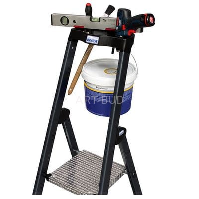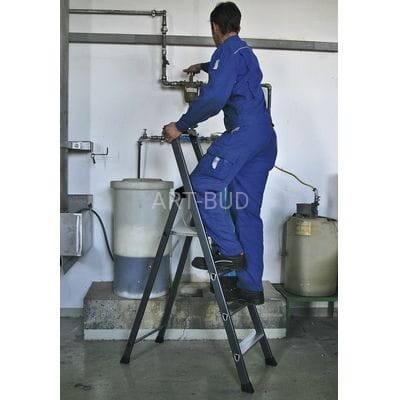 Drabina wolnostojąca ze stopniami z wysoko umieszczonym pałąkiem bezpieczeństwa, oraz dużą aluminiową półką.