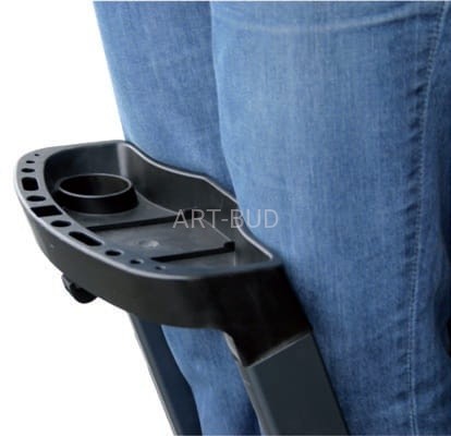 Duża ergonomiczna półka z zaokrąglonymi krawędziami i zintegrowanym hakiem na wiadro.