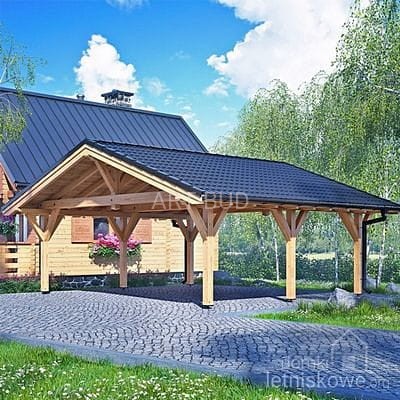 Niezwykle modna, efektowna, drewniana wiata garażowa w formie przestronnego zadaszenia bez ścian bocznych. Jej masywna konstrukcja z naturalnych belek drewnianych, doskonale komponuje się na posesjach prywatnych czy wypoczynkowych w otoczeniu naturalnej zieleni i kwiatów.