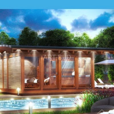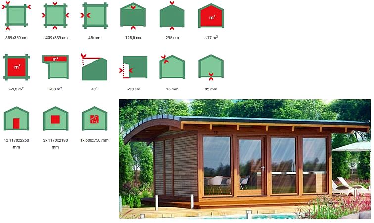 Ekskluzywny domek z balików sosnowych z całkowicie przeszkloną ścianą frontową i łukowym dachem, sprawdzi się jako luksusowy domek letniskowy, ale równocześnie może znaleźć zastosowanie jako pawilon handlowy, usługowy, czy gastronomiczny przy ruchliwym pasażu.
