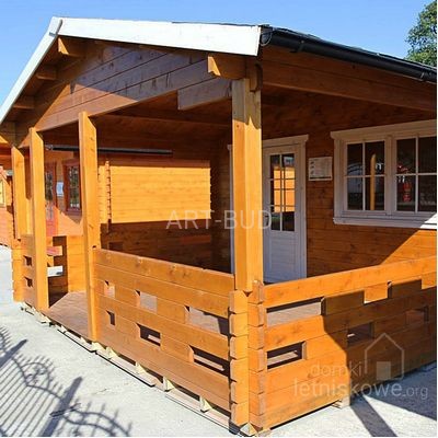 Drewniany domek letniskowy Olga może pełnić rolę domku na wynajem, ale doskonale sprawdzi się również jako domek dla gości czy w Rodzinnych Ogródkach Działkowych. Niewielka powierzchnia zabudowy części mieszkalnej pozwoli na budowę bez pozwolenia budowlanego, a duży zadaszony taras na wygodne spędzanie czasu na świeżym powietrzu. Wymiar zewnętrzny domku bez elementów wystających wynosi 480x680 cm, gdzie część mieszkalna mierzy 480x380 cm, a taras 480x290 cm. Dwuspadowy dach o powierzchni 42 m2 osłania cały domek łącznie z tarasem. Ściany domku zostały wykonane z litego bala świerkowego o grubości 45 mm, natomiast dach i podłoga kolejno z desek o grubości 19 i 28 mm. Doskonale dopasowane elementy konstrukcyjne gwarantują wytrzymałość, stabilność i łatwość montażu domku. Olga w wersji standardowej składa się z jednego pomieszczenia o powierzchni 17,47 m2, dając bardzo duże możliwości aranżacji. Zbliżony wielkością do wnętrza domku taras umożliwia swobodne ustawienie kompletu mebli ogrodowych. Z przodu domku znajdują się duże dwuskrzydłowe przeszklone drzwi wejściowe oraz podwójne uchylno-rozwierane okno systemowe. Drugie dwuskrzydłowe uchylno-rozwierane okno znajduje się domyślnie z lewej strony budynku. Na życzenie klienta projekt domku można zmodyfikować np. zmieniając stronami drzwi i okno na froncie budynku czy wydzielając mniejsze pomieszczenie. Razem z domkiem dostępny jest pełen pakiet usług dodatkowych łącznie z ociepleniem, malowaniem i montażem.