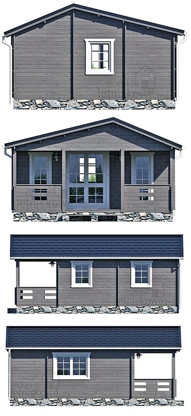Powierzchnię domku dzielą cztery widne pomieszczenia oraz taras. Największe przechodnie pomieszczenie często służy za salon połączony z aneksem kuchennym. Dwa średnie pokoje mogą posłużyć za dwie oddzielne sypialnie, natomiast najmniejsze pomieszczenie za łazienkę z prysznicem. Szeroki na 6 m i długi na 2 m, w pełni zadaszony taras pozwoli spędzać czas na świeżym powietrzu nawet podczas niepogody. Domek wyposażony jest w duże dwuskrzydłowe drzwi z wejściem od strony tarasu oraz troje jednoskrzydłowych drzwi prowadzących do wszystkich pomieszczeń wewnątrz. Po bokach drzwi wejściowych znajdują dwa nieotwierane okna wpuszczające światło do salonu oraz jednej z sypialni. Pokój dzienny został dodatkowo wyposażony duże dwuskrzydłowe uchylno-rozwierane okno oraz jedno okno mniejsze umieszczone na tylnej ścianie budynku. Obie sypialnie
