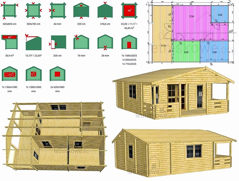 | Wymiar z el. wystającymi:600 x 800 cm Wymiar bez el. wystających: 580 x 780 cm Grubość ściany: 45 mm Wysokość ściany: 228 cm Wysokość w szczycie: 318,6 cm Powierzchnia zabudowy: 33,6 m2 Powierzchnia dachu: 55,9 m2 Kąt nachylenia dachu: 13,73o, 22,55o Wypust dachu: 200 cm Grubość deski dachowej: 19 mm Grubość deski podłogowej: 28 mm Wymiar belki podwalinowej: 45 x 90 mm Ilość drzwi: 1x 1580x2025 mm, 2x 830x2025 mm, 1x 710x1890 mm Ilość okien nieotwieralnych: 2x 620x1890 mm Ilość podw. okien uch. rozw.: 1x 1580x1080 mm, 3x 830x1080 |