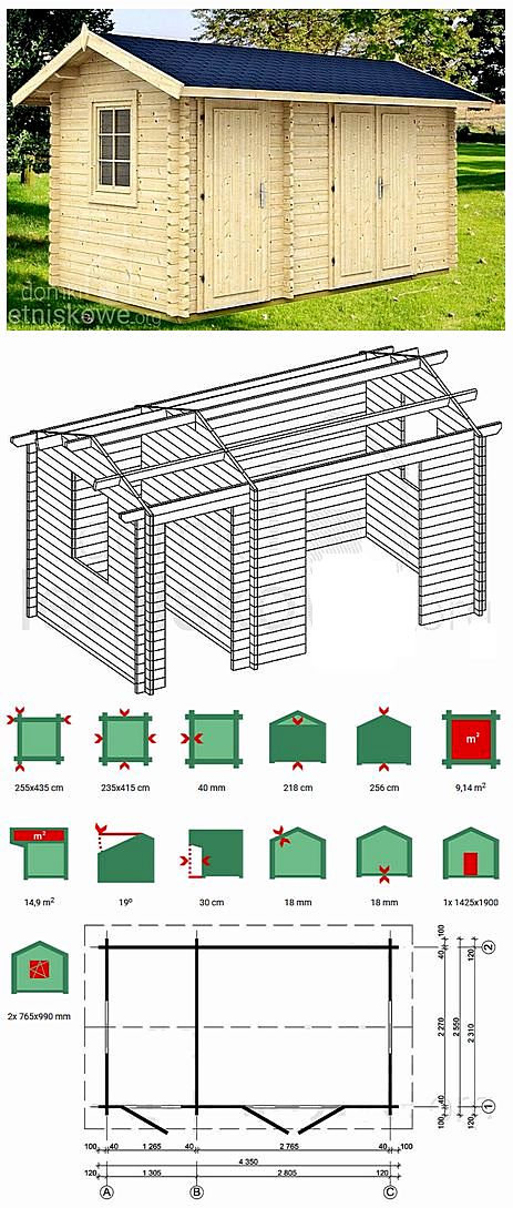 | Wymiar z el. wystającymi: 255 x 435 cm Wymiar bez el. wystających: 235 x 415 cm Grubość ściany: 40 mm Wysokość ściany: 218 cm Wysokość w szczycie:256 cm Powierzchnia zabudowy: 9,14 m2 Powierzchnia dachu: 14,9 m2 Kąt nachylenia dachu:19o Wypust dachu:30 cm Grubość deski dachowej:18 mm Grubosć deski podłogowej:18 mm Wymiar belki podwalinowej:45 x 70 mm Ilość drzwi: 1x 1425 x1900 mm, 1x 840 x 1900 mm Ilość okien uch. rozw.: 2x 765 x 990 mm |