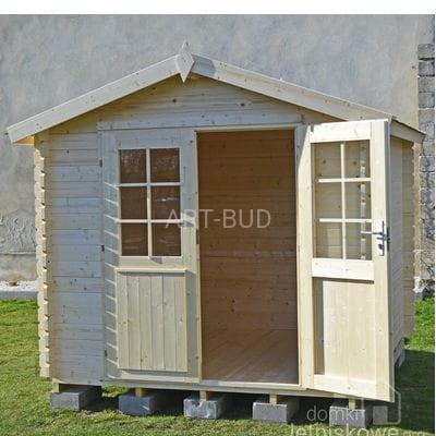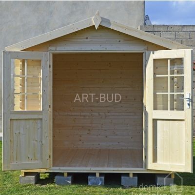 Z przodu konstrukcji znajdują się duże, dwuskrzydłowe częściowo przeszklone drzwi wejściowe. Wnętrze domku stanowi jedno pomieszczenie o powierzchni 5,3 m2. Z przodu domku i po bokach znajduje się dwudziesto centymetrowy wypust dachu. Domek może zostać pomalowany lub zmontowany przez jedną z naszych profesjonalnych ekip montażowych.