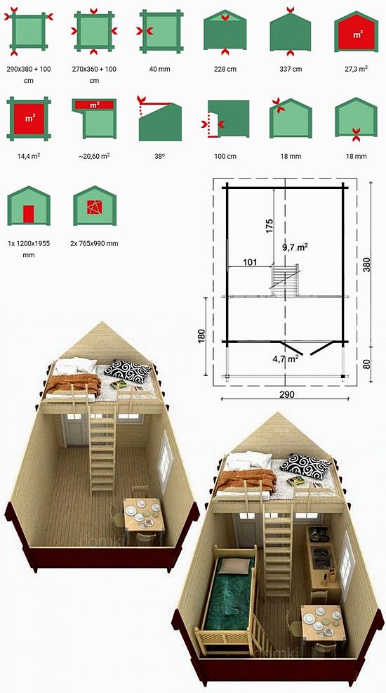 | Wymiar z el. wystającymi: 290x380 cm Wymiar bez el. wystających: 270×360 cm Grubość ściany: 40 mm Wysokość ściany: 228 cm Wysokość w szczycie: 337 cm Powierzchnia zabudowy: 14,4 m2 Powierzchnia dachu: ~20,6 m2 Kubatura konstrukcji: 27,3 m3 Kąt nachylenia dachu: 38o Wypust dachu: 100 cm Grubość deski dachowej: 18 mm Grubość deski podłogowej: 18 mm Wymiar belki podwalinowej: 45x70 mm Ilość drzwi: 1x 1200x1955 mm Ilość okien uch. rozw.: 2x 765x990 mm |