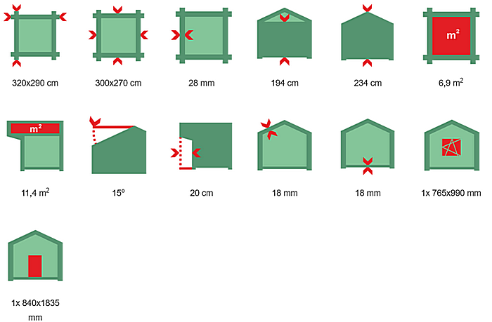 | Wymiar z el. wystającymi:320x290 cm Wymiar bez el. wystających: 300x270 cm Grubość ściany: 28 mm Wysokość ściany: 194 cm Wysokość w szczycie: 234 cm Powierzchnia zabudowy: 8,1 m2 Powierzchnia dachu: 11,4 m2 Kubatura konstrukcji: 16,4 m3 Kąt nachylenia dachu: 15o Wypust dachu: 20 cm Grubość deski dachowej: 18 mm Grubosć deski podłogowej:18 mm Wymiar belki podwalinowej: 45x70 mm Ilość drzwi: 1x 840x1835 mm Ilość okien uch. rozw.: 1x 765x990 mm |