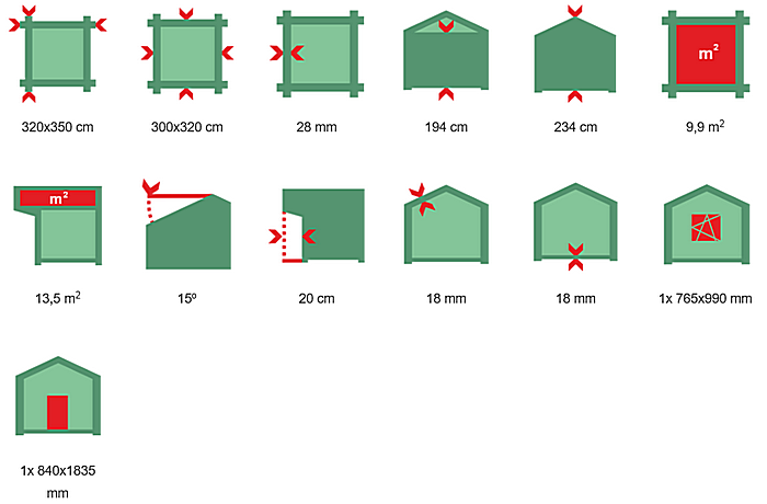 | Wymiar z el. wystającymi: 320x350 cm Wymiar bez el. wystających: 300x330 cm Grubość ściany: 28 mm Wysokość ściany: 194 cm Wysokość w szczycie: 234 cm Powierzchnia zabudowy: 9,9 m2 Powierzchnia dachu: 13,5 m2 Kubatura konstrukcji: 20,1 m3 Kąt nachylenia dachu: 15o Wypust dachu: 20 cm Grubość deski dachowej: 18 mm Grubosć deski podłogowej: 18 mm Wymiar belki podwalinowej: 45x70 mm Ilość drzwi: 1x 840x1835 mm Ilość okien uch. rozw.: 1x 765x990 mm |