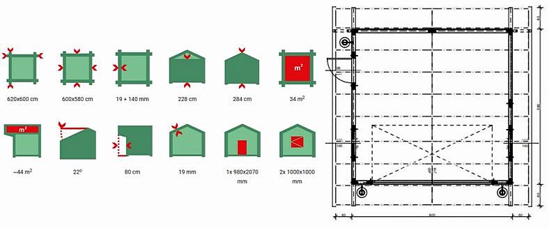 | Wymiar z el. wystającymi: 620x600 cm Wymiar bez el. wystających: 600x580 cm Grubość ściany: 19 + 140 mm Wysokość ściany: 228 cm Wysokość w szczycie: 284 cm Powierzchnia zabudowy: 34,8 m2 Powierzchnia dachu: ~44 m2 Kąt nachylenia dachu: 22o Wypust dachu: 80 cm Grubość deski dachowej: 19 mm Ilość drzwi: 1x 980x2070 mm Ilość okien uch. rozw.: 2x 1000x1000 mm |